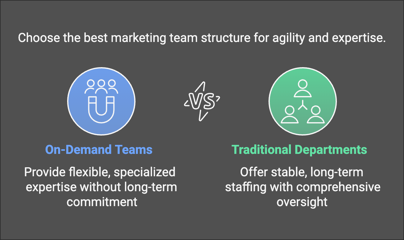 Compared to traditional marketing departments, on-demand teams offer the advantage of accessing top-tier expertise across various disciplines—from content creation and SEO to analytics and paid media—without the long-term commitment and costs associated with full-time hires. This model allows businesses to scale their marketing efforts up or down as needed, ensuring they stay competitive in today’s dynamic market.