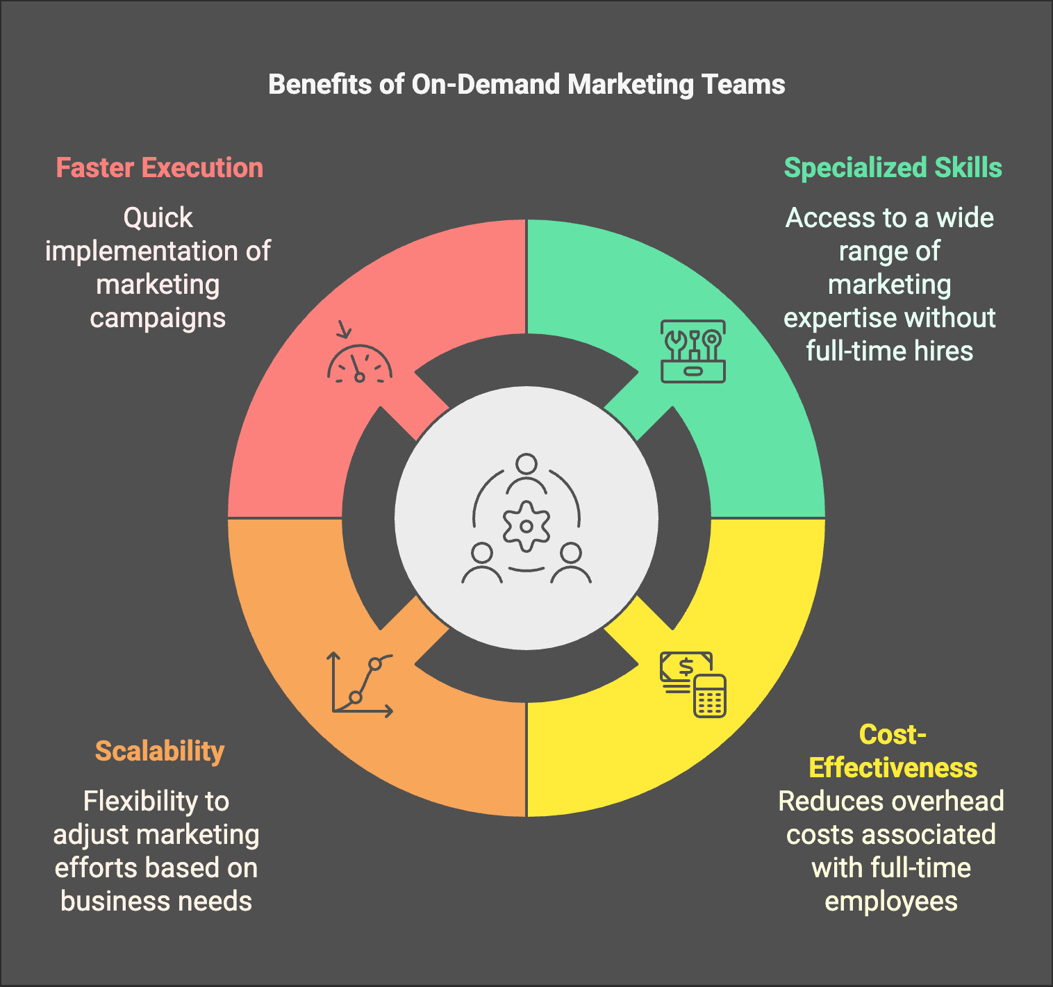 Scalability and adaptability are crucial in today’s dynamic market. On-demand marketing teams offer the flexibility to scale efforts up or down based on business needs, ensuring companies can respond swiftly to market changes or new opportunities. This agility is complemented by faster execution and reduced time-to-market for campaigns. As one service provider notes, “Tap into unparalleled results so fast, you’ll want to keep us as your secret”.