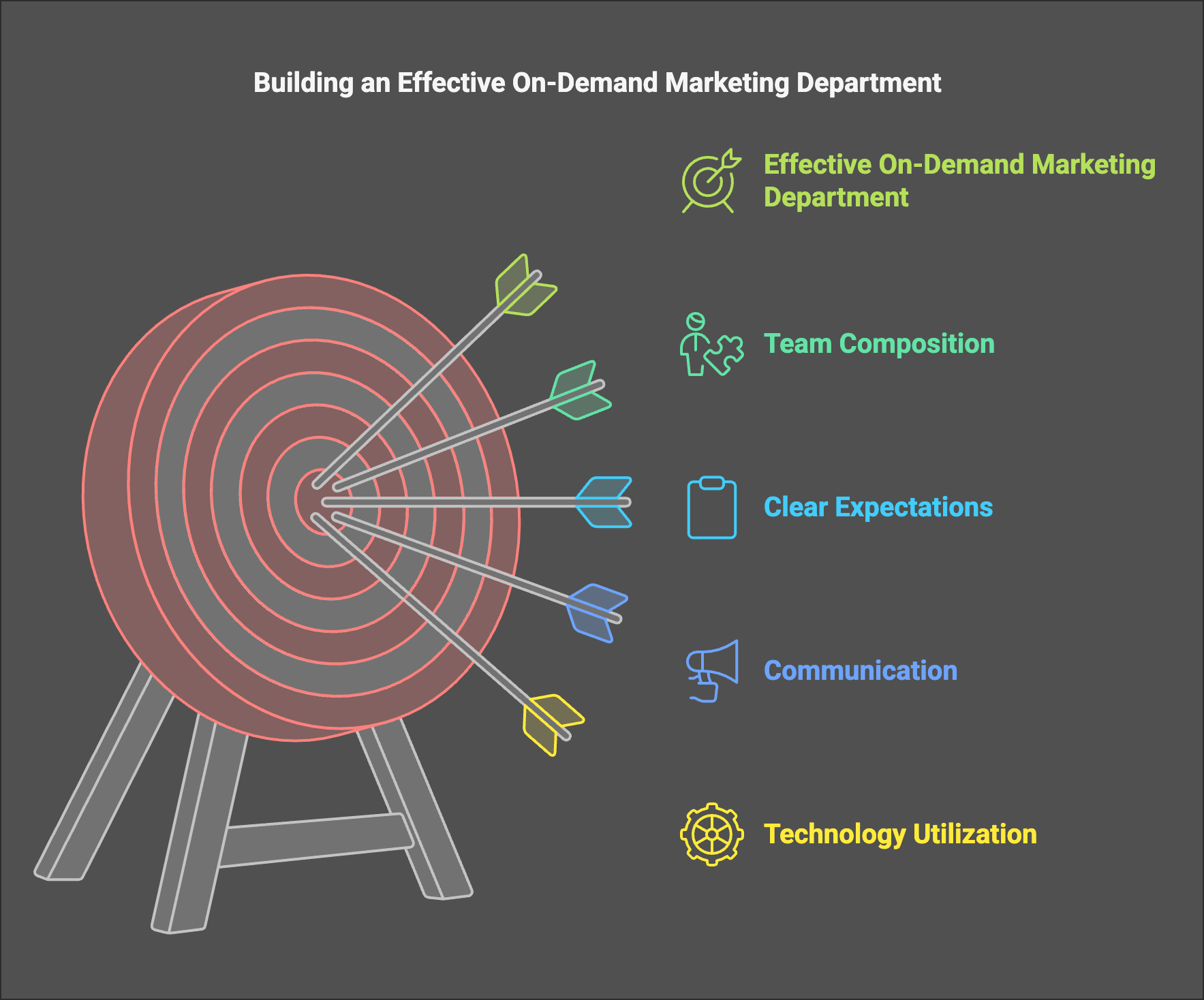 Building an effective on-demand marketing department requires careful planning and execution. The first step is identifying the right mix of freelancers and agency partners. Validate they have industry experience and the right infrastructure and technologies in place to execute. This ensures you have access to the specialized skills needed for your marketing initiatives.