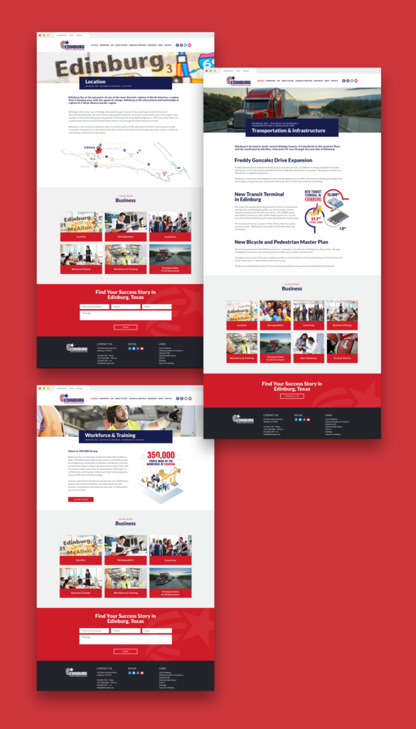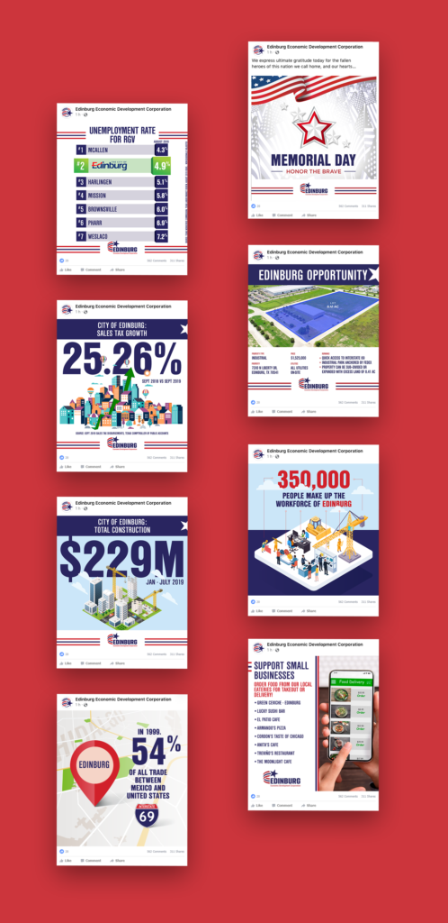 CODESM’s solution was to create a comprehensive marketing approach that highlighted Edinburg’s many benefits across many marketing channels. CODESM began by rebranding the Edinburg EDC and redesigning their website with the goal of showcasing the many reasons businesses should consider moving into the city. Visually compelling and conversion driven, this rebrand and redesign delivered a persuasive message that encouraged action. In addition, CODESM created digital campaigns and ads to drive business into the city. Carefully targeted using select keywords, these beautifully designed ads were complemented by an active social media presence. Together, these online efforts promoted real estate available for industrial use and made a strong case for choosing Edinburg. Finally, CODESM provided a wide array of graphics, collateral trade show materials, and supportive print materials. These items promoted the EDC’s events, supported their goals, and ensured a positive image in front of all of their target audiences.